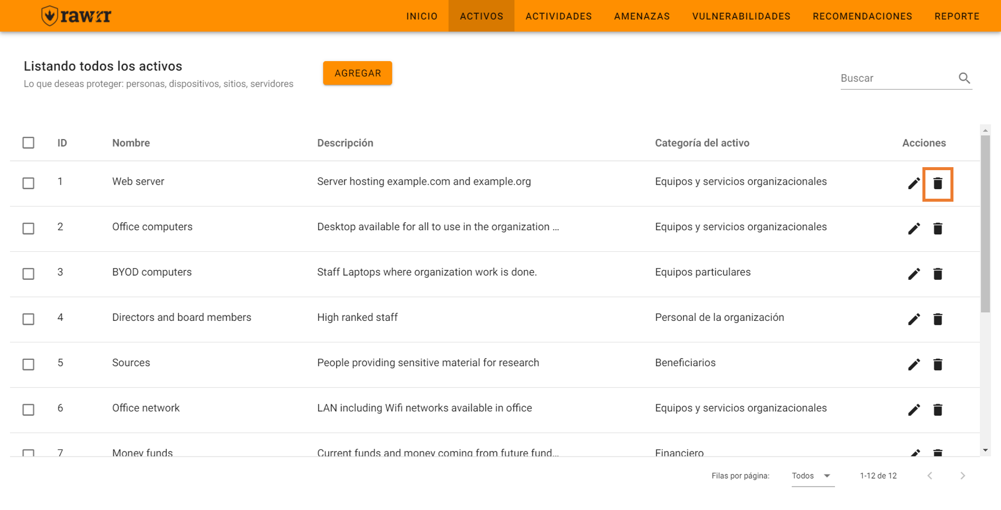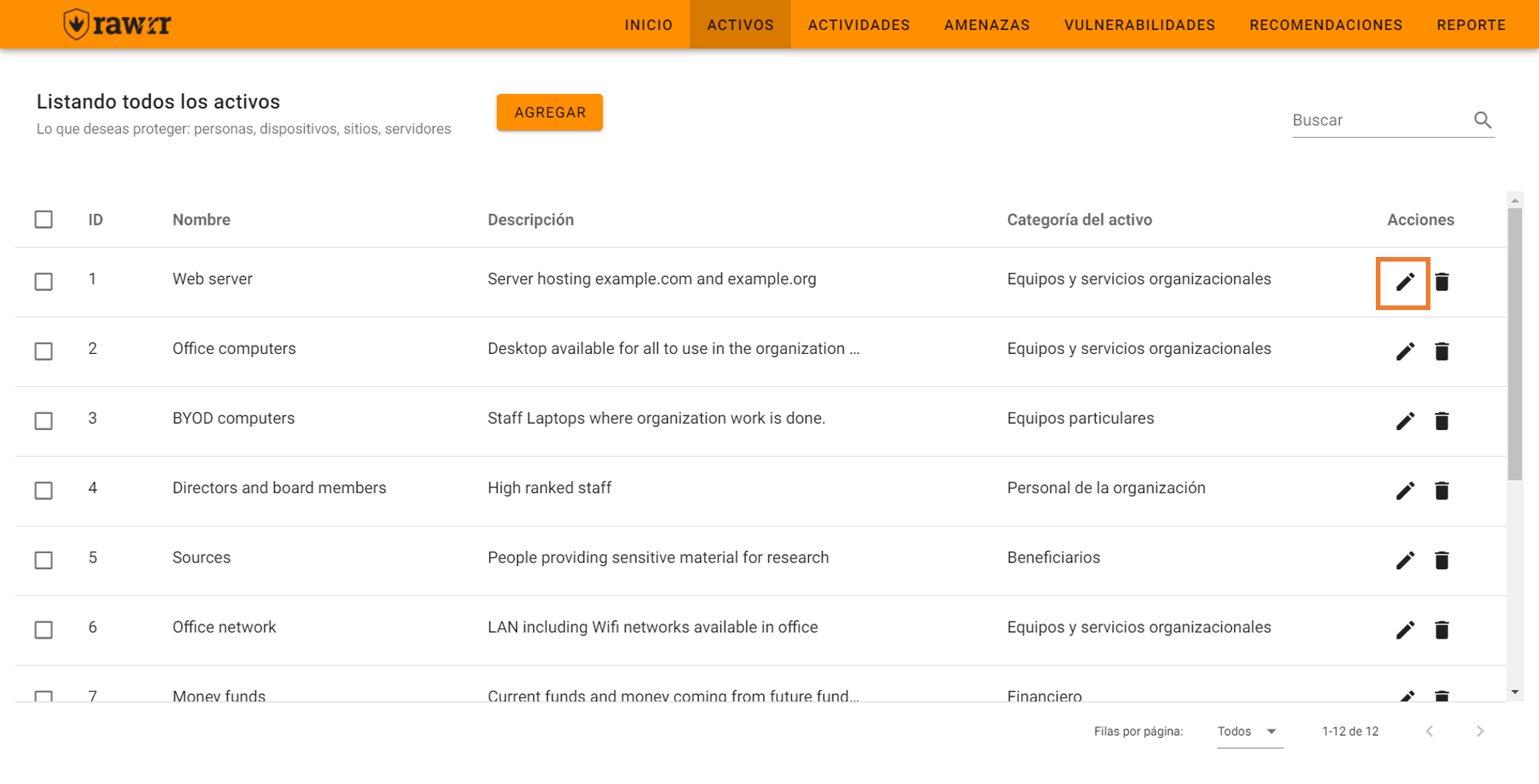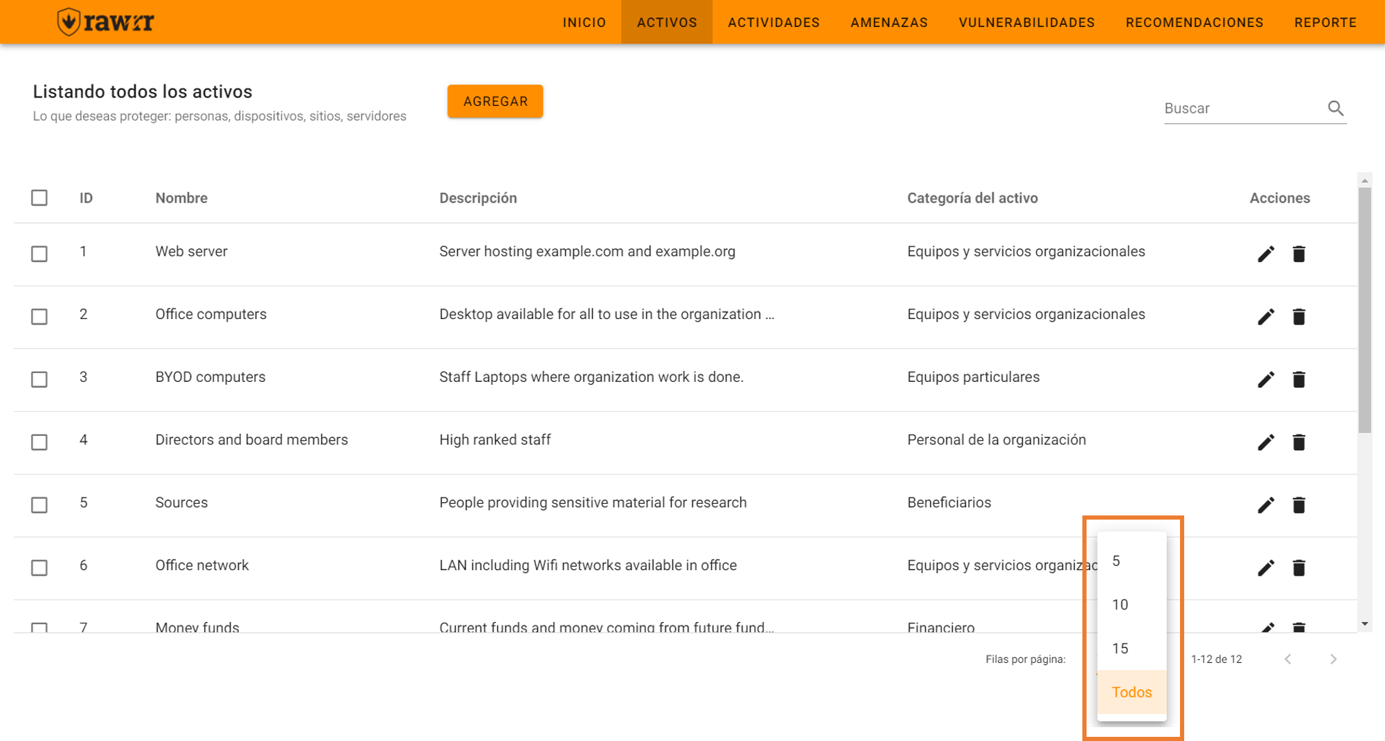 Si has iniciado RAWRR importando un archivo o cargando los valores de prueba, es conveniente que puedas revisar detenidamente la información precargada antes de crear o editar algún elemento. Para ver la lista completa de activos puedes hacer clic en “Todos” en la parte inferior derecha junto a la frase “Filas por página”. También puedes seleccionar ver cinco (5), diez (10) o quince (15) elementos por página.