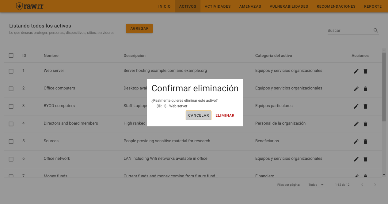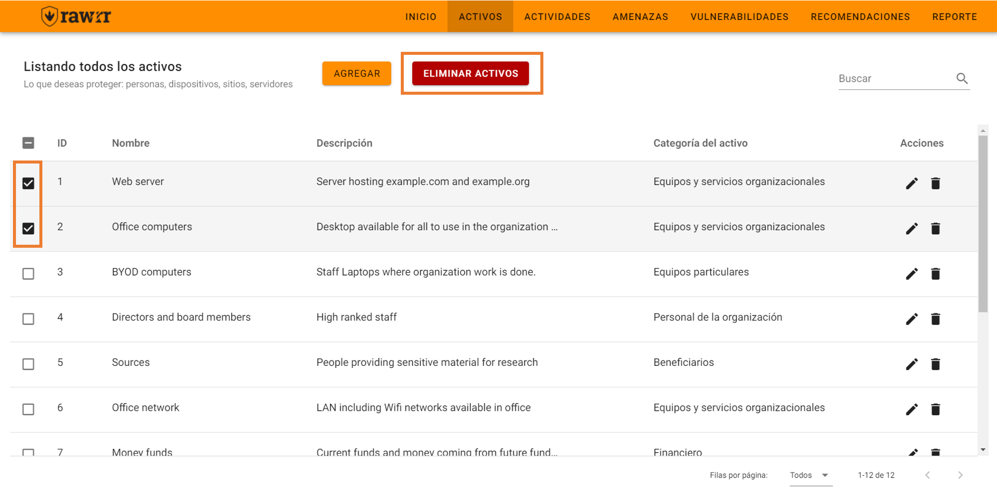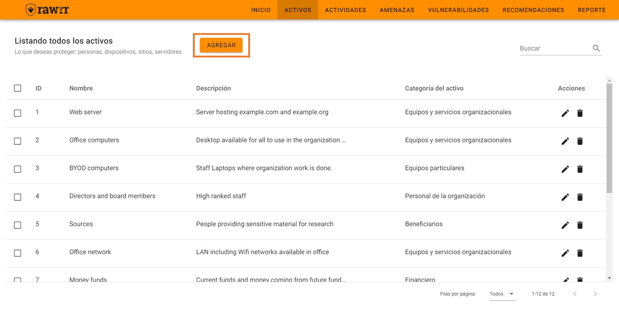 Si has iniciado RAWRR importando un archivo o cargando los valores de prueba, es conveniente que puedas revisar detenidamente la información precargada antes de crear o editar algún elemento. Para ver la lista completa de activos puedes hacer clic en “Todos” en la parte inferior derecha junto a la frase “Filas por página”. También puedes seleccionar ver cinco (5), diez (10) o quince (15) elementos por página.