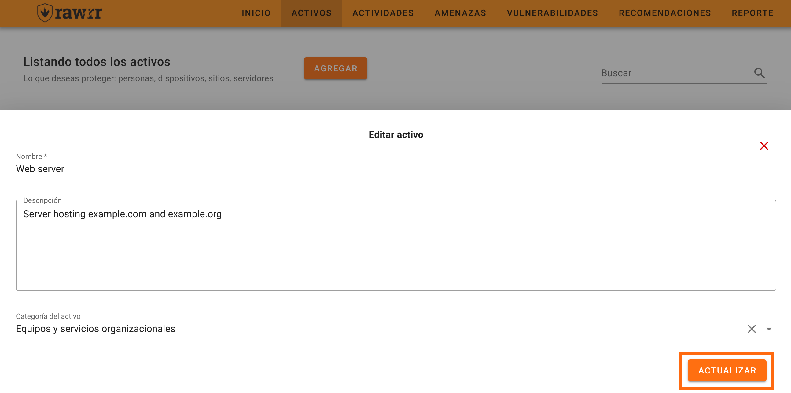 Cuando termines de editar los campos de nombre, descripción y/o categoría, haz clic en “Actualizar” para guardar los cambios en el activo que seleccionaste.