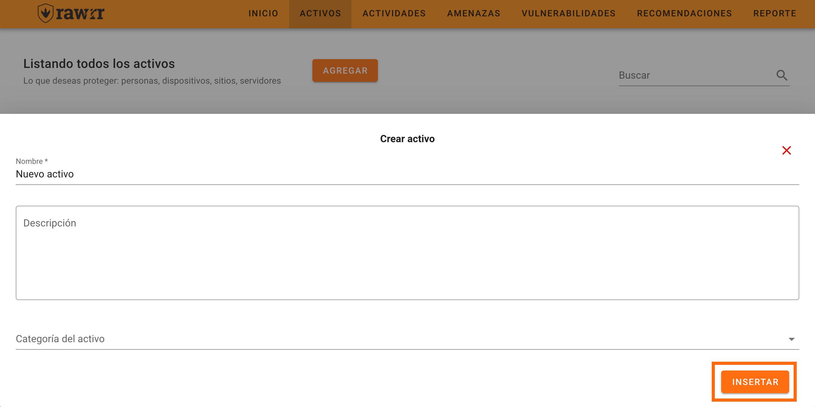 Para agregar activos haz click en “Agregar” arriba a la izquierda y completa los campos que aparecerán en el formulario: nombre, descripción y categoría.